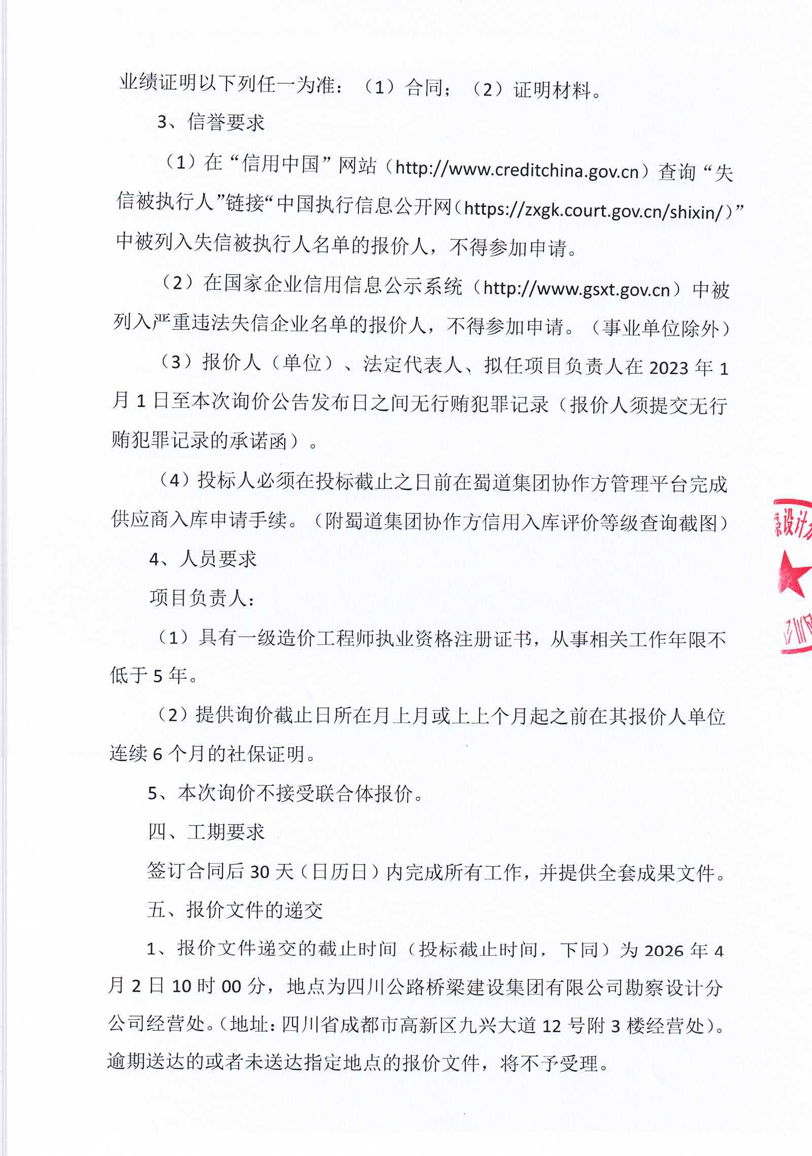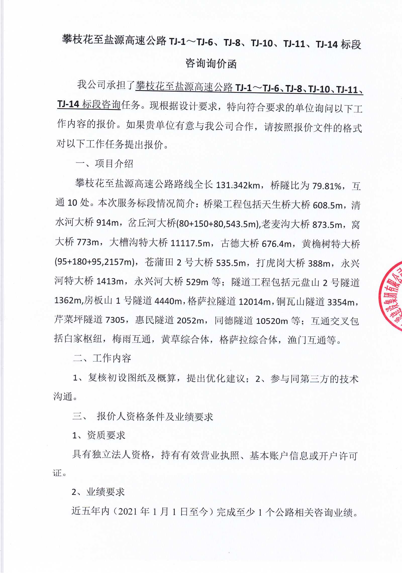 攀枝花至盐源高速公路TJ-1~TJ-6、TJ-8、TJ-10、TJ-11、TJ-14标段咨询询价函